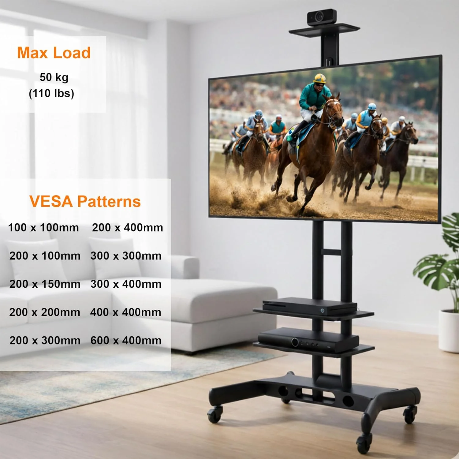 With a strong 50 kg load capacity and VESA compatibility up to 600×400 mm, this rolling TV cart securely supports most LED, LCD, and OLED televisions from leading brands.