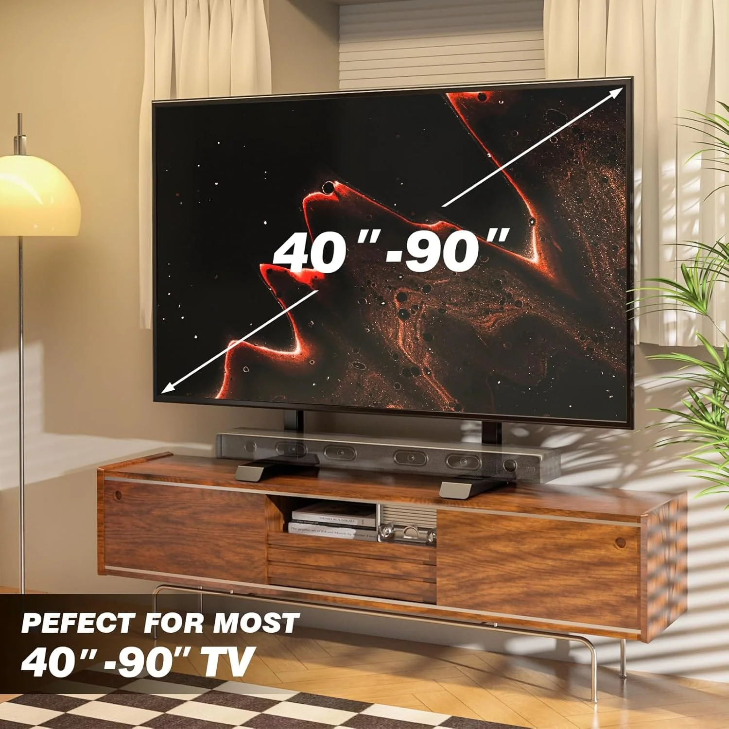 This tabletop TV stand fits most 55″–90″ flat or curved TVs from leading brands including Samsung, Sony, LG, TCL, Hisense, and more.